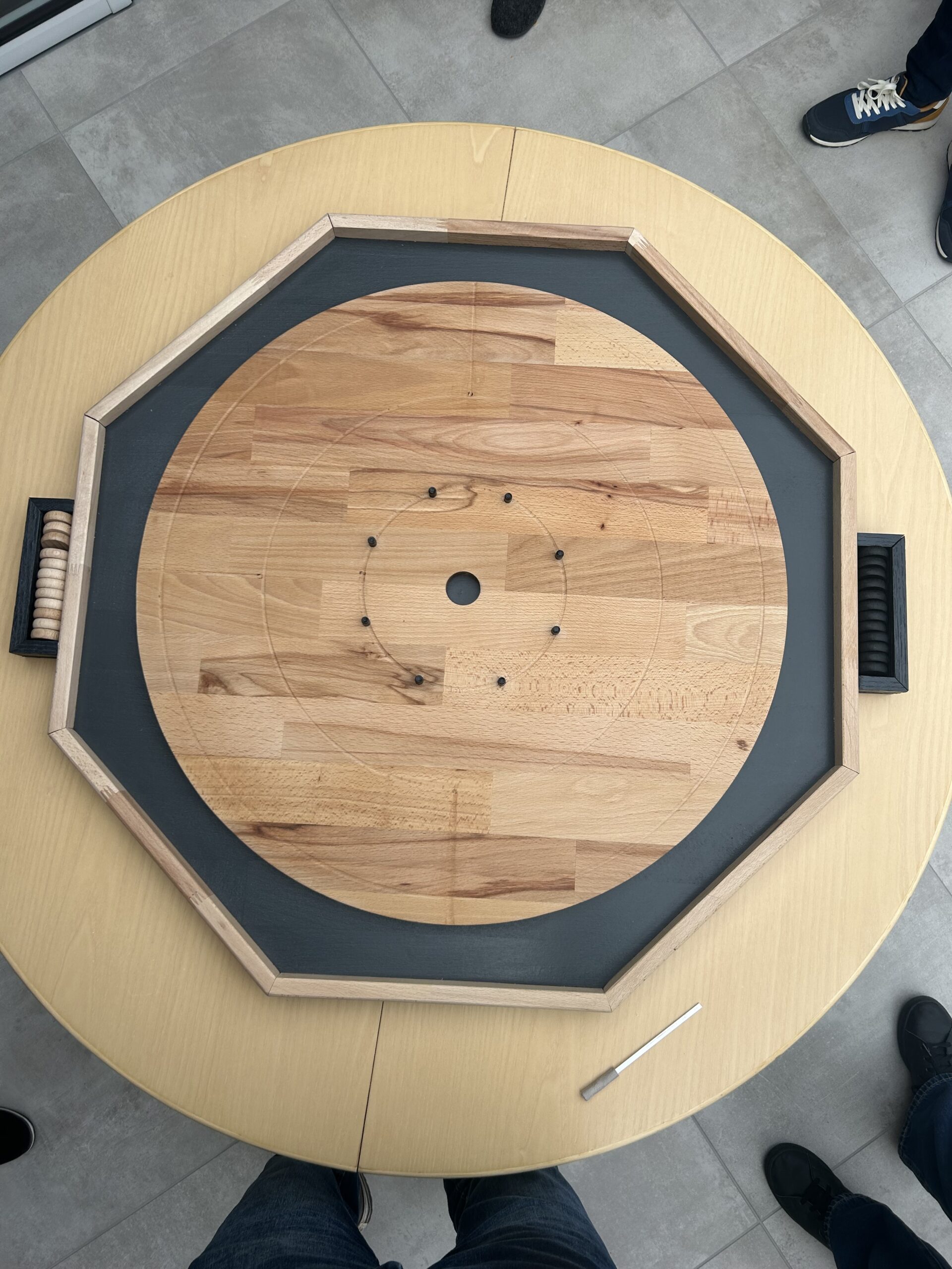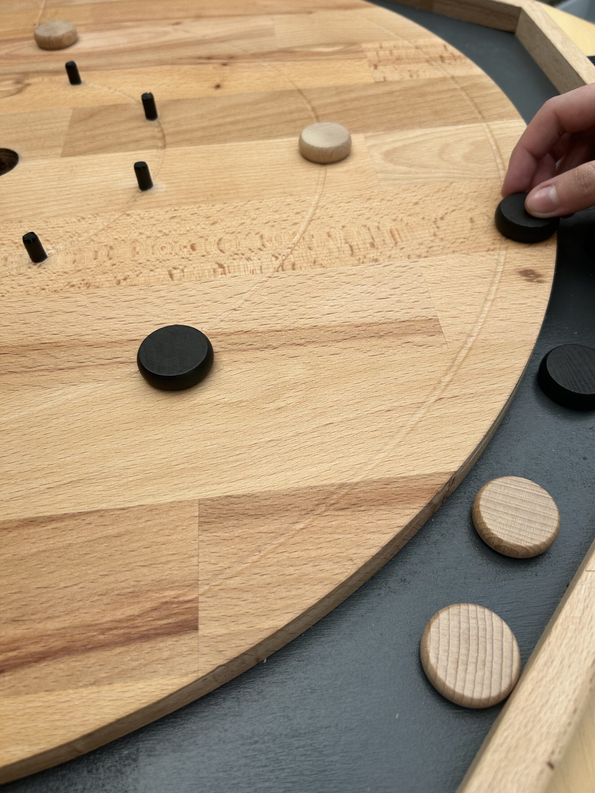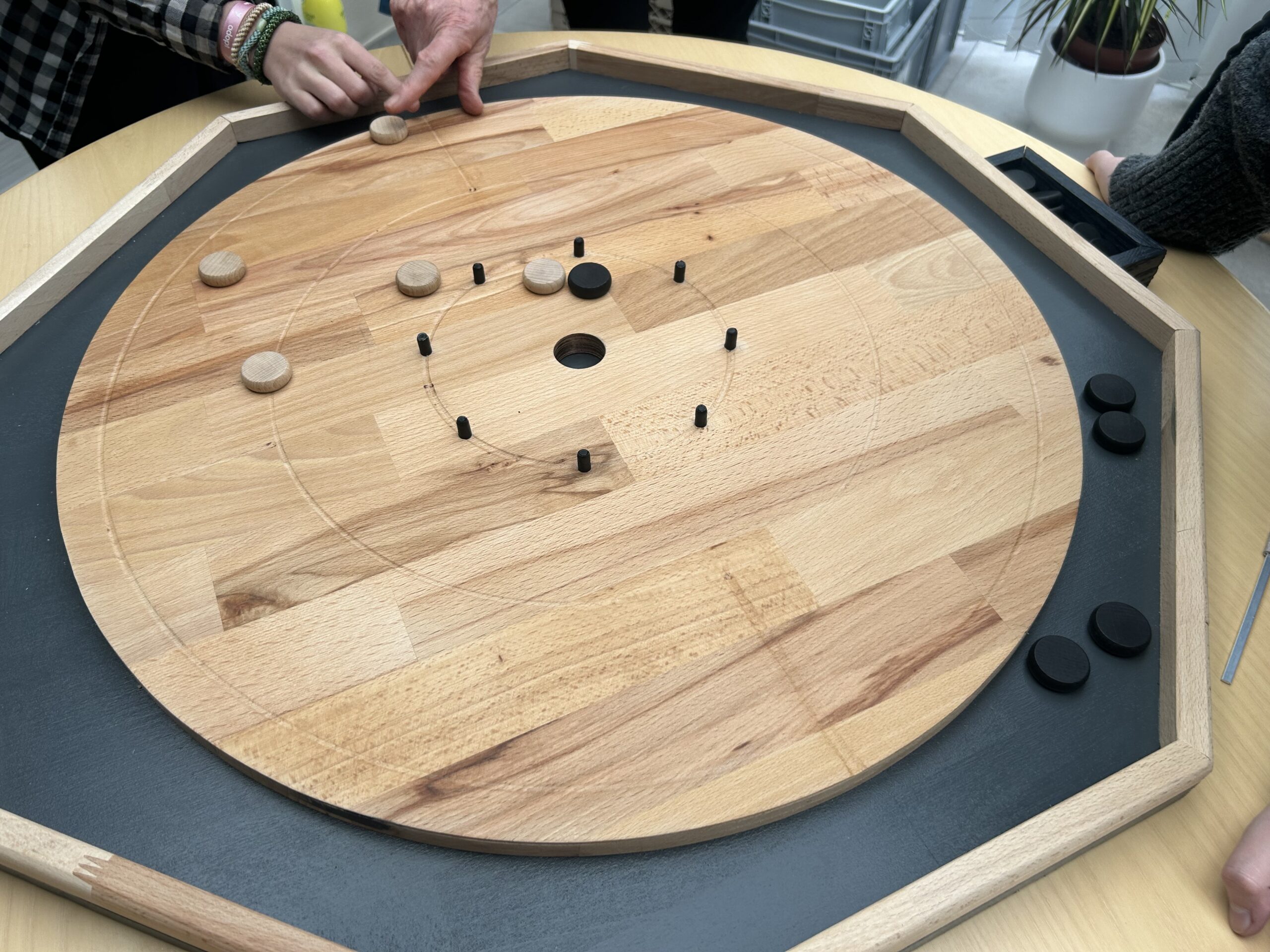 Le Crokinole est un jeu d’adresse et de dextérité. Il est très populaire en Amérique du Nord. Le principe étant de projeter ses palets par  » pichenette  » de l’index, en tentant soit de cibler la zone centrale, soit de sortir les palets adverses, selon la situation. (Règle en détail plus bas)