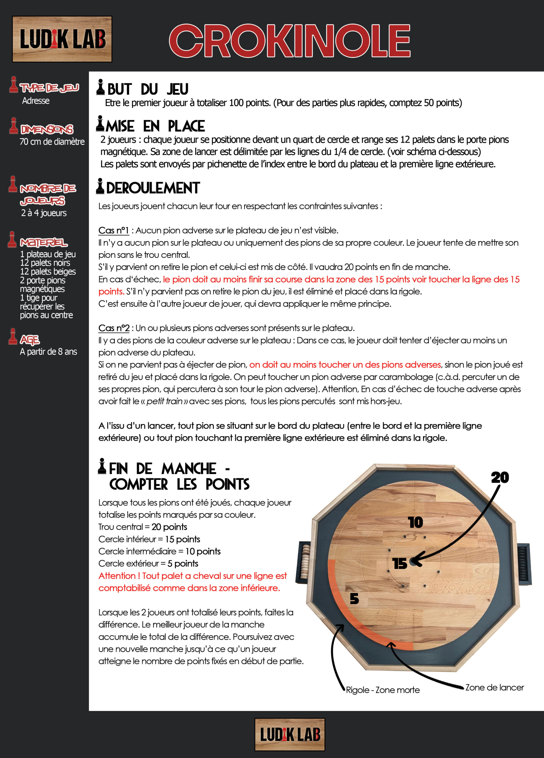 Le Crokinole est un jeu d’adresse et de dextérité. Il est très populaire en Amérique du Nord. Le principe étant de projeter ses palets par  » pichenette  » de l’index, en tentant soit de cibler la zone centrale, soit de sortir les palets adverses, selon la situation. (Règle en détail plus bas)